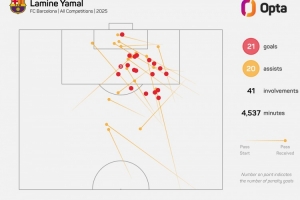 Opta指出,五大聯(lián)賽球員之中,僅亞馬爾、奧利塞2025年各賽事進(jìn)球20+且助攻20+,其中亞馬爾21球20助,奧利塞21球24助。