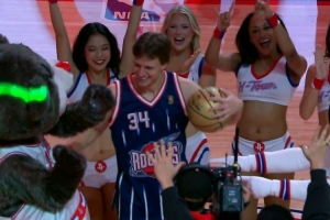 GIF-火箭球迷中場(chǎng)Logo三分打板命中 喜獲25000美元大獎(jiǎng)