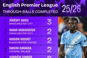 體育資訊9月24日訊 本賽季英超戰(zhàn)罷5輪,“Squawka”統(tǒng)計了所有球員成功完成直塞次數(shù)的排名,曼城邊鋒多庫以3次領(lǐng)跑。