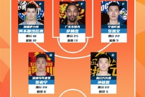 2025-2026賽季CBA聯(lián)賽常規(guī)賽第8輪結(jié)束較量,來自新疆廣匯籃球俱樂部的阿不都沙拉木 ,廣東宏遠(yuǎn)籃球俱樂部的薩林杰,寧波富邦町渥男籃的羅凱文,深圳新世紀(jì)烈豹籃球俱樂部的賀希寧和浙江廣廈籃球俱樂部的孫銘徽入選CBA聯(lián)賽常規(guī)賽第8輪最佳陣容!