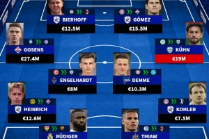 后衛(wèi):海因里希(多特→佛羅倫薩,1260萬歐)、呂迪格(斯圖加特→羅馬,1300萬歐)、佳夫(沙爾克→米蘭,1280萬歐)、科勒爾(拜仁→尤文,750萬歐)