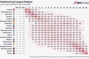 opta預(yù)測英超奪冠概率↓