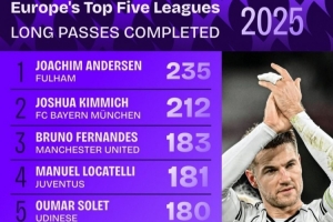 體育資訊1月1日訊 2025年已經(jīng)結(jié)束,數(shù)據(jù)機(jī)構(gòu)squawka也統(tǒng)計(jì)了2025年成功長傳情況,富勒姆的后衛(wèi)安諾森領(lǐng)跑。