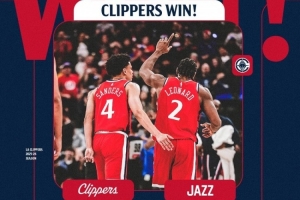 賽后快船發(fā)布本場比賽贏球海報(bào),萊昂納德單手指天!
