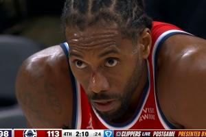 比賽末節(jié)8分56秒,小卡上籃時(shí)被小克萊頓掃到了面部打出了血,但是爵士居然挑戰(zhàn)成功了,結(jié)果變成了小卡被帽、快船出界;