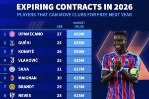 體育資訊1月2日訊 2026年已經(jīng)到來,多位知名球員將在今夏合同到期,《轉(zhuǎn)會(huì)市場(chǎng)》也統(tǒng)計(jì)了今夏合同到期球員的最貴身價(jià)榜,三大中衛(wèi)包攬前三。