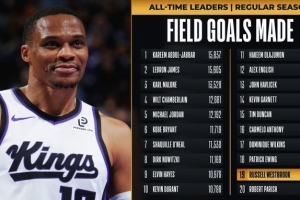 本場比賽過后,威少運動戰(zhàn)進球數(shù)9615個,超越帕里什升至歷史第19位,排在他前面的是尤因的9702次。