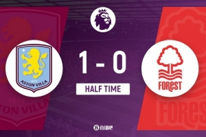 傷停補時1分鐘。上半場比賽結束,阿斯頓維拉1-0諾丁漢森林。