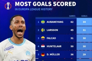 體育資訊9月25日訊 德國轉(zhuǎn)會(huì)市場(chǎng)盤點(diǎn)了歐聯(lián)杯球員歷史進(jìn)球排名,奧巴梅揚(yáng)34球居首。