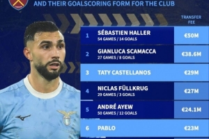 德轉(zhuǎn)列西漢姆前鋒引援榜(及效力時(shí)期進(jìn)球數(shù)據(jù)):歐元