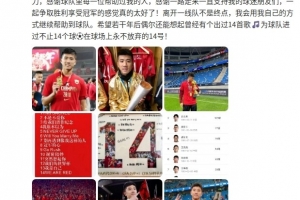 從全運(yùn)會小將到今天的老將,很幸運(yùn)職業(yè)生涯能一直在上海海港這么棒的俱樂部效力,感謝球隊(duì)里每一位幫助過我的人,感謝一路走來一直支持我的球迷朋友們,一起爭取勝利享受冠軍的感覺真的太好了!離開一線隊(duì)不是終點(diǎn),我會用我自己的方式繼續(xù)幫助到球隊(duì)。希望若干年后偶爾還能想起曾經(jīng)有個(gè)出過14首歌??為球隊(duì)進(jìn)過不止14個(gè)球??在球場上永不放棄的14號!