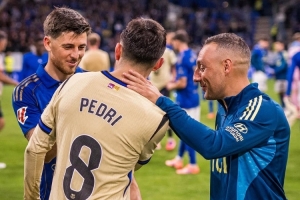 巴薩中場佩德里賽后與皇家奧維耶多40歲中場卡索拉交流,巴薩官方社媒曬出視頻,配文:“兩位球場魔術(shù)師。”