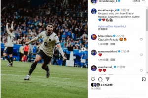 阿勞霍社媒曬照慶祝取勝,他寫道:“又邁出一步,懷著謙遜與努力。我們繼續(xù)前進,巴薩球迷們!”