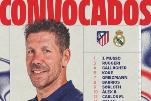 馬競(jìng)大名單:1-穆索、3-魯杰里、4-加拉格爾、6-科克、7-格列茲曼、8-巴里奧斯、9-索爾洛特、10-巴埃納、12-卡洛斯-馬丁、13-奧布拉克、14-馬科斯·略倫特、15-朗格萊、16-莫利納、17-漢茨科、18-普比爾、19-阿爾瓦雷斯、20-朱利亞諾-西蒙尼、21-加蘭、22-拉斯帕多里、23-尼科-岡薩雷斯、24-勒諾爾芒、26-科斯蒂斯、28-陶菲克、31-埃斯基韋爾
