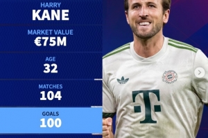 在拜仁4-0不萊梅的德甲聯(lián)賽中,凱恩完成梅開二度,打進自己在拜仁的第100球,同時也躋身為單一俱樂部最快打進100球的前十球員行列。