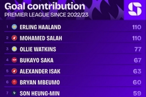 據(jù)Squawka的數(shù)據(jù)統(tǒng)計(jì),自哈蘭德加盟曼城以來,他已經(jīng)在英超聯(lián)賽直接參與110粒進(jìn)球,同期沒有哪名球員比他更多,只有薩拉赫同樣參與110粒進(jìn)球與他持平。