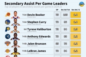 體育資訊9月28日訊 今天,數(shù)據(jù)媒體Extra列出了24-25賽季場均間接助攻(助攻傳球之前的那次傳球)前10,具體為:
