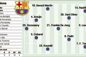 在邊路,一切跡象表明孔德和馬丁將會首發(fā),而巴爾德則蓄勢待發(fā),等待獲得一些出場時間。與巴爾德情況類似的是亞馬爾,他將在缺席一個月后于本周回歸。原則上,在拉菲尼亞缺陣后,弗里克開局將押注于由拉什福德、萊萬多夫斯基和費蘭-托雷斯組成的鋒線三叉戟。