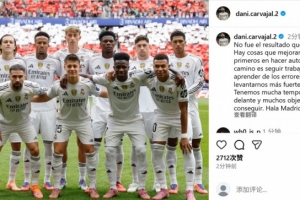 本場比賽受傷的卡瓦哈爾也在社媒曬出全隊(duì)合影鼓勵(lì)球隊(duì),配文寫道:“這不是我們想要的結(jié)果。我們需要改進(jìn)的地方還有很多,我們首先要進(jìn)行自我反省。接下來的路就是繼續(xù)努力,從錯(cuò)誤中學(xué)習(xí),并以更強(qiáng)的姿態(tài)重新站起來。賽季還很漫長,還有很多目標(biāo)需要實(shí)現(xiàn)。Hala Madrid! ”