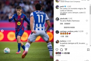佩德里當(dāng)選本場比賽最佳球員,賽后他在社交媒體上曬出比賽照片,配文:“重回蒙特惠奇球場,重返西甲榜首。一如既往的快樂,巴薩球迷們?!?/p>