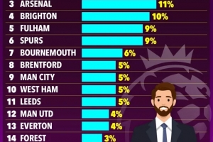 調查結果揭示了明顯的南北著裝差異,榜單前七名均被來自倫敦和南部的球隊包攬。曼城、利茲聯(lián)、布倫特福德和西漢姆聯(lián)以5%的數(shù)據(jù)并列第八。