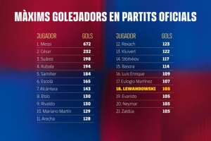 體育資訊9月29日訊 西甲第7輪,巴薩2-1擊敗皇家社會,萊萬破門,收獲巴薩生涯第105球,追平內馬爾、埃瓦里斯托和薩爾杜亞,位列隊史第18位。