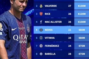 體育資訊9月30日訊 此前有報道稱曼城等球隊有意引進巴黎球員內(nèi)維斯,德轉(zhuǎn)也盤點了目前世界足壇中前衛(wèi)球員身價榜,其中佩德里以1.4億歐居首,內(nèi)維斯高居第五。具體如下: