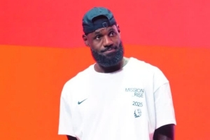 在活動臨近結(jié)束時,一位激動的男球迷沖上舞臺試圖接近詹姆斯,被主持人和安保阻攔。期間,詹姆斯顯得十分淡定,沒有任何反應(yīng)。在該沖動球迷被帶下舞臺后,詹姆斯無奈地?fù)u頭笑了笑。
