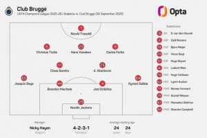 體育資訊10月1日訊 歐冠聯(lián)賽階段第2輪比賽,布魯日前往客場(chǎng)挑戰(zhàn)亞特蘭大。本場(chǎng)比賽,布魯日首發(fā)平均年齡僅為24歲24天,這創(chuàng)下了歐冠歷史首發(fā)平均年齡最年輕紀(jì)錄。