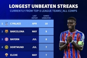 體育資訊10月1日訊 根據(jù)德轉(zhuǎn)統(tǒng)計(jì),水晶宮是五大聯(lián)賽當(dāng)前各項(xiàng)賽事不敗場(chǎng)次最多的球隊(duì),他們自4月以來(lái)已經(jīng)跨賽季18場(chǎng)不敗。
