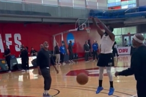 從視頻中可以看到,歐文正在練習運球后的投籃,幾個后撤步投籃動作都相當絲滑。