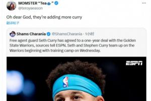 火箭隊球員伊森的母親轉發(fā)相關報道,評論道:“我的天哪,他們加了更多的‘咖喱’(Curry)?!?/p>