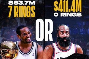 詹姆斯-哈登的(薪資)收入已經超過了4.11億美元,但NBA生涯至今冠軍數仍是0。