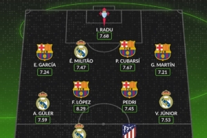 中場(chǎng):居勒爾(皇馬)7.59分、費(fèi)爾明(巴薩)8.29分、佩德里(巴薩)7.45分、維尼修斯(皇馬)7.53分