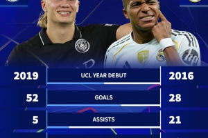 體育資訊10月2日訊 本輪歐冠,曼城2-2戰(zhàn)平摩納哥,哈蘭德在第50次歐冠出場梅開二度。德轉(zhuǎn)也盤點(diǎn)了目前足壇兩大前鋒哈蘭德、姆巴佩在前50場歐冠數(shù)據(jù),具體如下:
