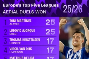 體育資訊9月12日訊 Squawka統(tǒng)計了本賽季球員在五大聯(lián)賽的爭頂成功次數,并列出榜單。