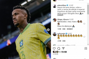 米利唐上次為巴西隊(duì)出戰(zhàn)要追溯到去年7月份,此后他因傷病長(zhǎng)期缺席,米利唐更新社媒動(dòng)態(tài),表達(dá)了入選巴西隊(duì)名單的喜悅之情。