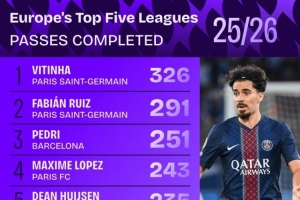 體育資訊9月12日訊 Squawka統(tǒng)計了本賽季球員在五大聯(lián)賽的成功傳球次數(shù),并列出榜單。