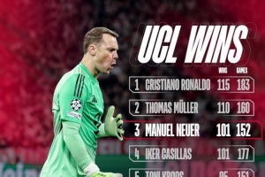 拜仁官方曬出了球員歐冠勝場(chǎng)排名,諾伊爾取勝101場(chǎng)與卡西并列歷史第三多,僅少于C羅和穆勒。