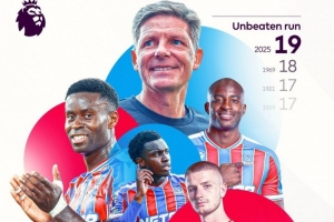 據(jù)英超官方統(tǒng)計,水晶宮各賽事19場不敗,創(chuàng)造隊史最長不敗紀(jì)錄。