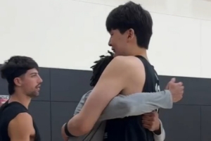 塞布爾一進門就熊抱楊瀚森打招呼,眾將面對鏡頭笑呵呵,而夏普則一臉嚴肅。