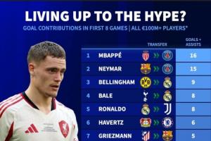 德轉“惡趣味”地統(tǒng)計了轉會費上億歐元的攻擊手們?yōu)樾虑蜿牫鰬?zhàn)前8場比賽,在進球+助攻上的貢獻榜單。姆巴佩、內(nèi)馬爾、貝林厄姆分列前3,而最后一名可謂是為了這碟醋才包的這盤餃子...