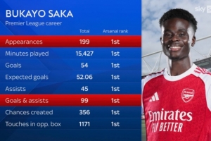 體育資訊10月4日訊 薩卡將迎來英超出戰(zhàn)200場里程碑,天空體育統(tǒng)計了薩卡首秀以來的英超數(shù)據(jù),他的出場次數(shù)、進球、助攻等多項數(shù)據(jù)阿森納隊內(nèi)同期居首。