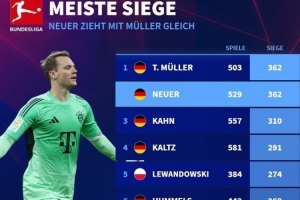 體育資訊10月5日訊 德轉(zhuǎn)統(tǒng)計了德甲球員獲勝場次排名,諾伊爾362場追平托馬斯-穆勒,并列第一。