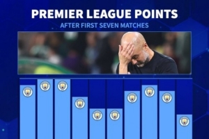 體育資訊10月6日訊 英超第7輪比賽,曼城客場1-0戰(zhàn)勝布倫特福德。德國轉(zhuǎn)會市場統(tǒng)計(jì)了瓜迪奧拉執(zhí)教曼城賽季前7輪比賽的積分,本賽季13分創(chuàng)新低。