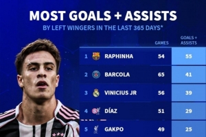 五大聯(lián)賽左邊鋒近一年參與進(jìn)球榜(所有賽事):