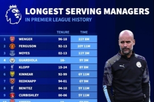 體育資訊10月9日訊 德轉(zhuǎn)列出了英超歷史上的主帥任職時(shí)長榜,溫格、弗格森前二,瓜迪奧拉第四,克洛普第五。