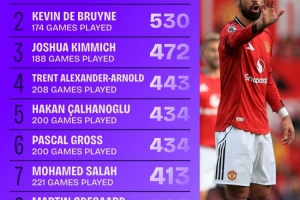 體育資訊10月10日訊 據(jù)Squawka統(tǒng)計,2019-2020賽季以來,B費創(chuàng)造557次機會,五大聯(lián)賽同期最多。