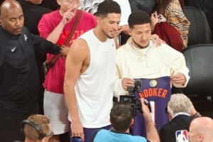 賽后,布克的模仿者和布克合影留念,并獲得布克的親簽球衣,對(duì)此,布克說(shuō)道:“很高興看到中文布克。因?yàn)榭臻g的距離,我以為我們相遇的希望渺茫,但中國(guó)賽是相遇的完美地方。我最終給了他我的比賽球衣?!?/p>
