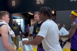 體育資訊10月11日訊 今日,湖人官方Instagram曬出一段昨日東契奇在訓(xùn)練后向全隊贈送自己的簽名球鞋的花絮視頻。